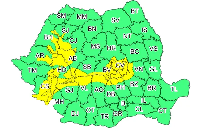 Judeţele atenţionate sunt: Sălaj, Cluj, Bihor, Alba, Arad, Timiş, Hunedoara, Caraş-Severin, Mehedinţi, Gorj, Sibiu, Vâlcea, Braşov, Covasna, Argeş, Dâmboviţa, Prahova, Buzău şi Vrancea.