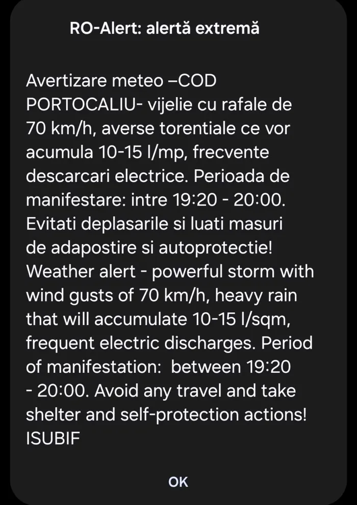 De asemenea, cetățenii din zonele vizate de avertizarea meteo au primit pe telefon mesajul RO-ALERT.