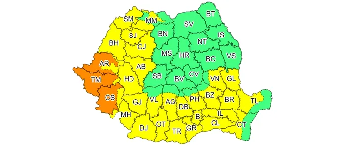 De sâmbătă urmează un cod galben de instabilitate atmosferică temporar accentuată și ploi puternice. Potrivit ANM, sâmbătă între orele 12.00 – 10.00, vor fi perioade cu instabilitate atmosferică accentuată, la început în Banat, Oltenia și în zonele montane, apoi în extindere în toată jumătatea vestică a teritoriului. Vor fi averse torențiale, descărcări electrice, intensificări ale vântului și pe alocuri vijelii și grindină.