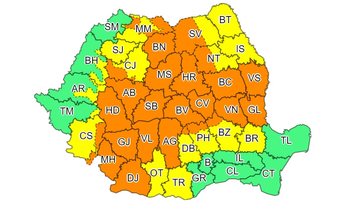 Administrația Națională de Meteorologie (ANM) a emis o avertizare cod portocaliu pentru 25 de județe, de marți, ora 10:00, până miercuri, la aceeași oră.