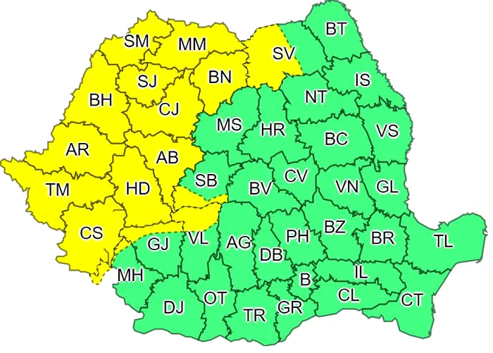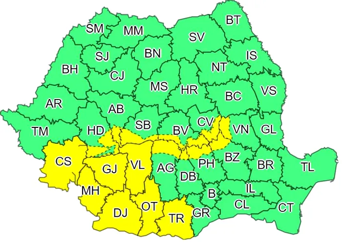 Administrația Națională de Meteorologie (ANM) a emis sâmbătă două avertizări tip Cod galben de instabilitate atmosferică accentuată și de vânt puternic.