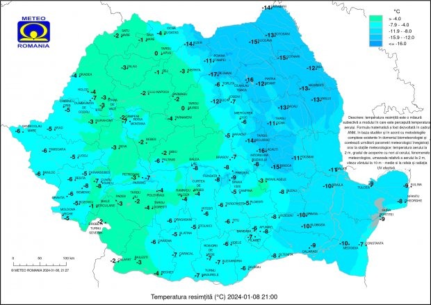 Harta temperaturilor resimțite în România. ANM prezintă harta temperaturilor care vor „paraliza” România, cu geruri de până la -30 de grade Celsius.