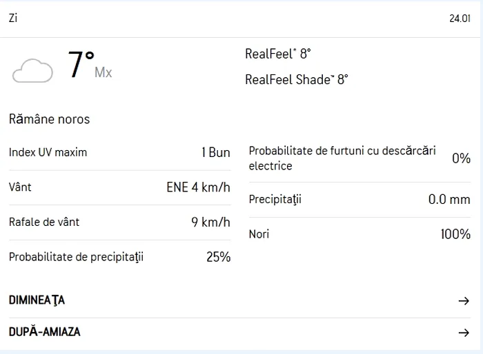 În data de 25 ianuarie, aceștia vor avea parte de aceleași temperaturi, iar în 26 ianuarie, temperaturile scad la 0 grade, respectiv o minimă negativă de -5.