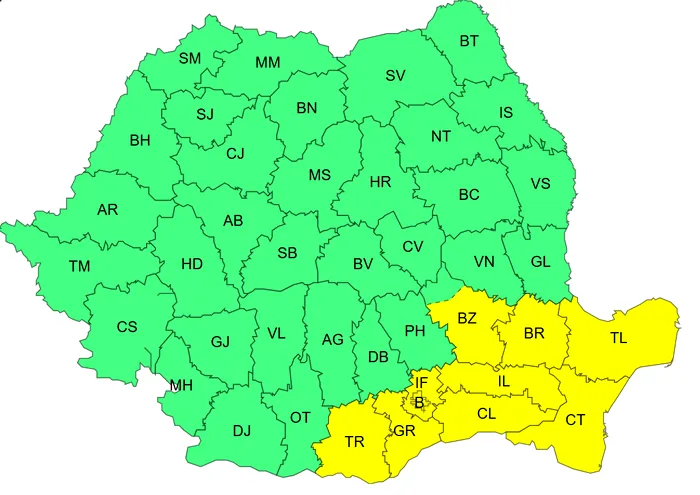 Administrația Națională de Meteorologie a emis și o atenționăre Cod Galben de vânt pentru nouă județe, valabilă până la ora 20:00.