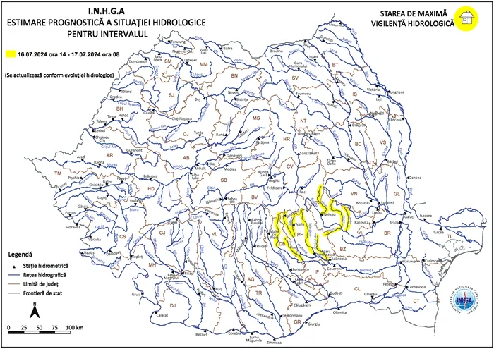 „În intervalul 16.07.2024 ora 14:00 – 17.07.2024 ora 08:00 pe râurile din bazinele hidrografice: Ialomiţa – bazin amonte S.H. Pucioasa şi afluenţii aferenţi sectorului aval S.H. Pucioasa – amonte S.H. Siliştea Snagovului (judeţele: Dâmboviţa, Prahova şi Ilfov), Prahova – bazin superior şi afluenţi bazin mijlociu şi inferior (judeţele: Prahova şi Ialomiţa), Buzău – afluenţii aferenţi sectorului aval Ac. Siriu – amonte S.H. Baniţa (judeţele: Buzău, Covasna şi Prahova). Atenţionarea Hidrologică vizează în principal fenomenele de scurgeri importante pe versanţi, torenţi şi pâraie şi viituri rapide pe râurile mici, cu posibile efecte de inundaţii locale. Acestea se pot produce cu probabilitate şi intensitate mai mare începând de astăzi, de la ora 18:00, până la miezul nopţii, pe unele râuri mici din judeţele Dâmboviţa şi Prahova”, a mai transmis sursa citată.