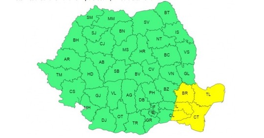 Potrivit prognozei ANM, în intervalul 28 august, ora 10:00 – 29 august, ora 10:00, judeţele Tulcea, Constanţa, Brăila şi parţial Ialomiţa şi Călăraşi vor fi afectate de averse, intensificări de scurtă durată ale vântului, cu viteze cuprinse între 45 şi 55 km/h, şi descărcări electrice trecătoare. Cantităţile de apă vor depăşi local 15 – 25 l/mp şi, izolat, 30 – 40 l/mp.