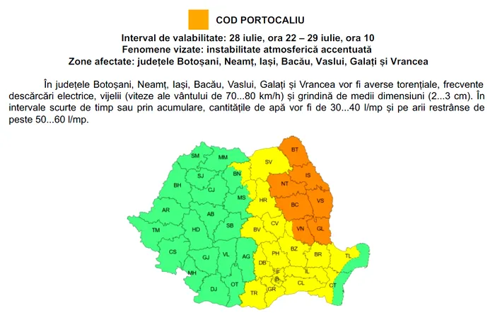 Un Cod portocaliu în vigoare între orele 16 – 22 anunță că în județele Suceava, Botoșani și Neamț, vor fi averse torențiale, frecvente descărcări electrice, vijelii puternice (viteze ale vântului de 70…80 km/h) și grindină de medii dimensiuni (2…3 cm). În intervale scurte de timp sau prin acumulare, cantitățile de apă vor fi de 30…40 l/mp și pe arii restrânse de peste 50…60 l/mp.