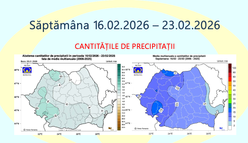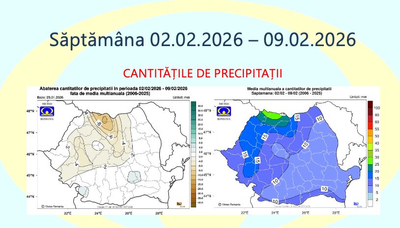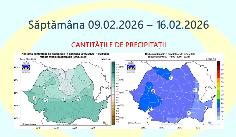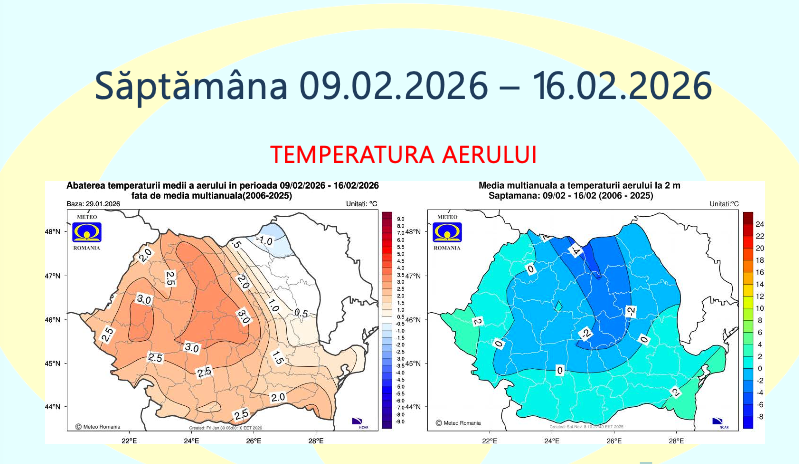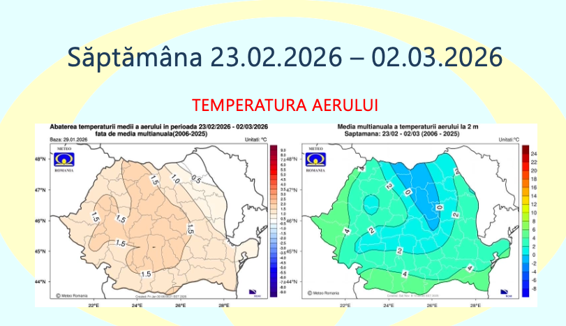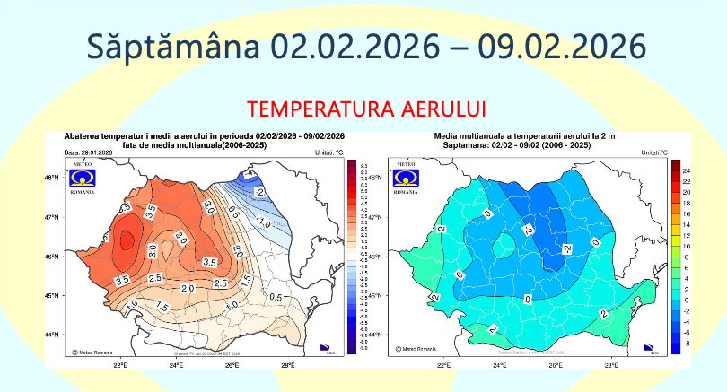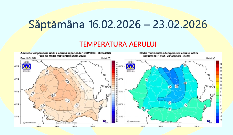 Administrația Națională de Meteorologie a publicat prognoza pentru perioada 2 februarie – 2 martie 2026, care indică temperaturi mai ridicate decât mediile climatologice în aproape toată țara, alături de episoade cu precipitații peste normal, în special la jumătatea lunii februarie.