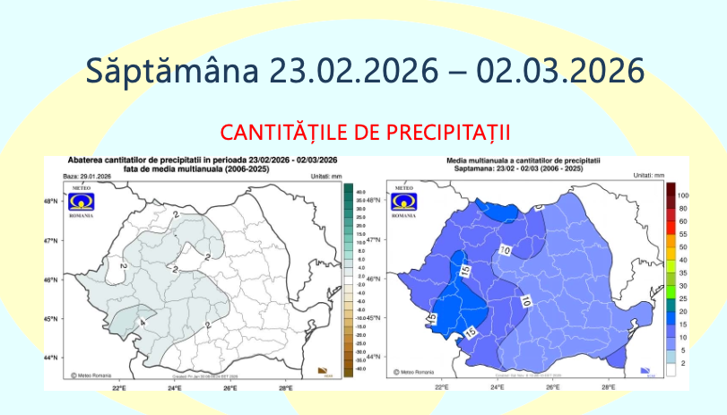 În ceea ce privește precipitațiile, regimul pluviometric va fi local deficitar în zonele montane, în timp ce în restul țării cantitățile de precipitații vor fi apropiate de normalul climatologic.