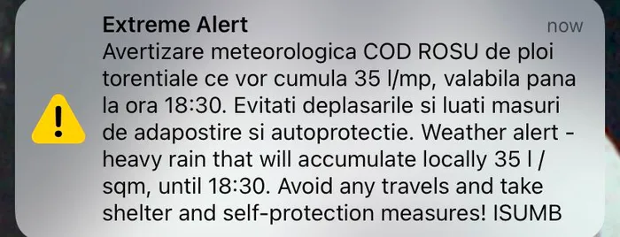 Aplicația RoAlert a emis o avertizare COD ROȘU de ploi în București. Potrivit alertei, precipitațiile vor cumula și 35l/mp.