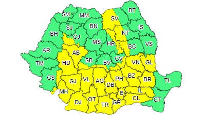 Administrația Națională de Meteorologie (ANM) a emis un cod galben de cantități însemnate de apă și vijelii, valabil în peste jumătate de țară până marți seara, la ora 22:00.
