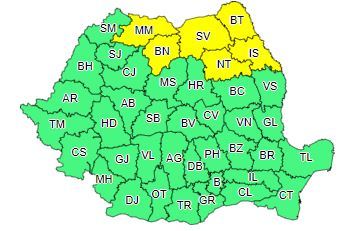 Administrația Națională de Meteorologie (ANM) a emis Cod galben de furtuni, cu ploi torenţiale, descărcări electrice şi, izolat, grindină, în şase judeţe din nordul şi nord-estul ţării.