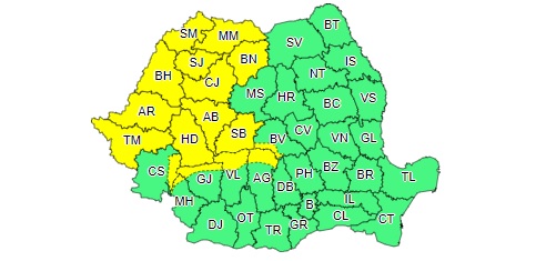 Administrația Națională de Meteorologie (ANM) a emis o avertizare Cod galben de instabilitate atmosferică valabilă joi între orele 12.00 – 21.00. În 17 județe pot apărea ploi torențiale, grindină și vijelii.