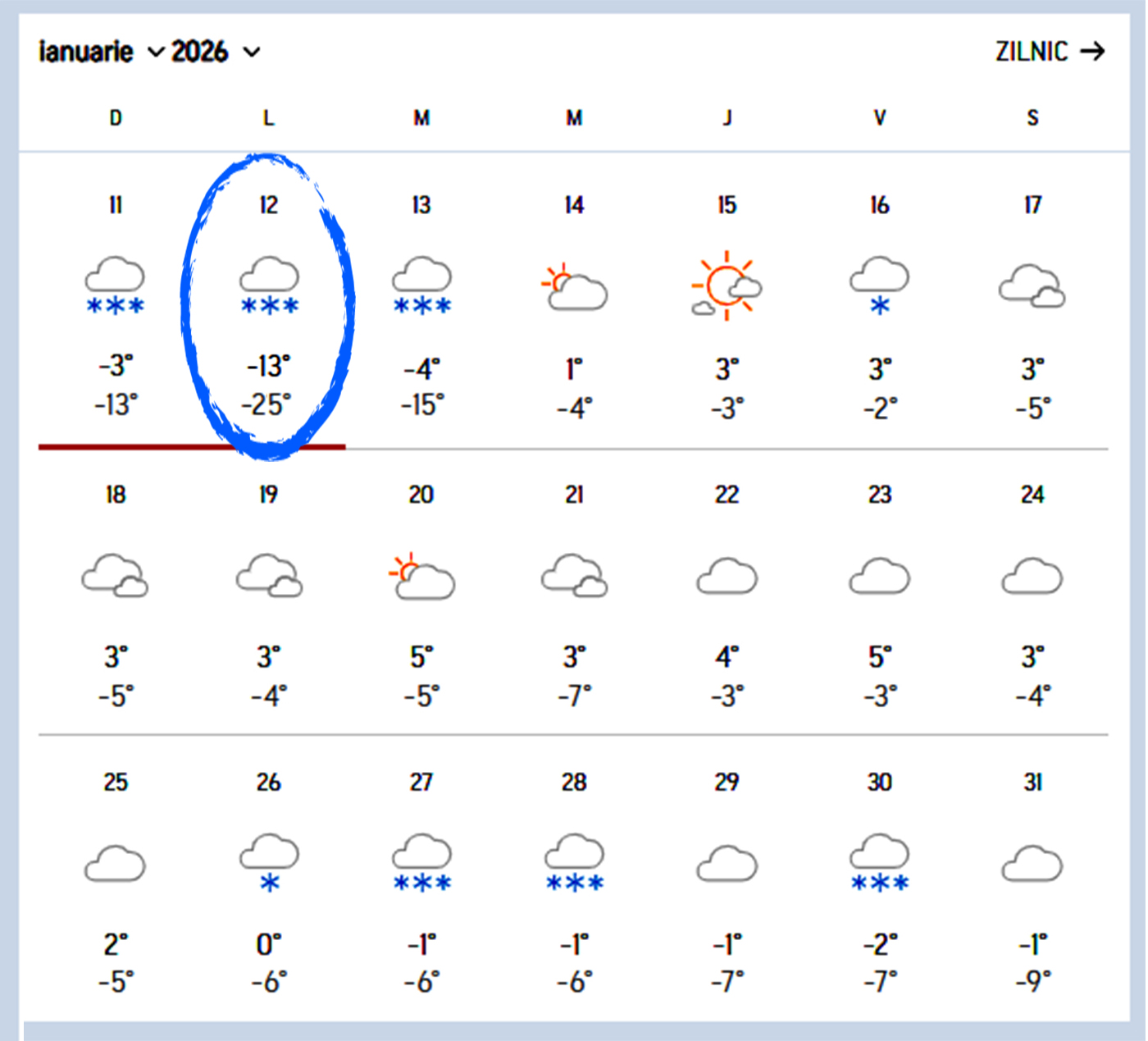 Pentru ziua de marți, 13 ianuarie, meteorologii Accuweather anunță tot ninsori și temperaturi de -4 grade pe timpul zilei și -15 grade pe timpul nopții. Soare va ieși dintre nori miercuri, 14 ianuarie 2026, și se oprește ninsoarea. Temperaturile mai cresc puțin: 1 grad pe timpul zilei și -4 grade pe timpul nopții. Săptămâna se încheie cu atmosferă închisă și mohorâtă și temperature situate între 3 și -5 grade C.