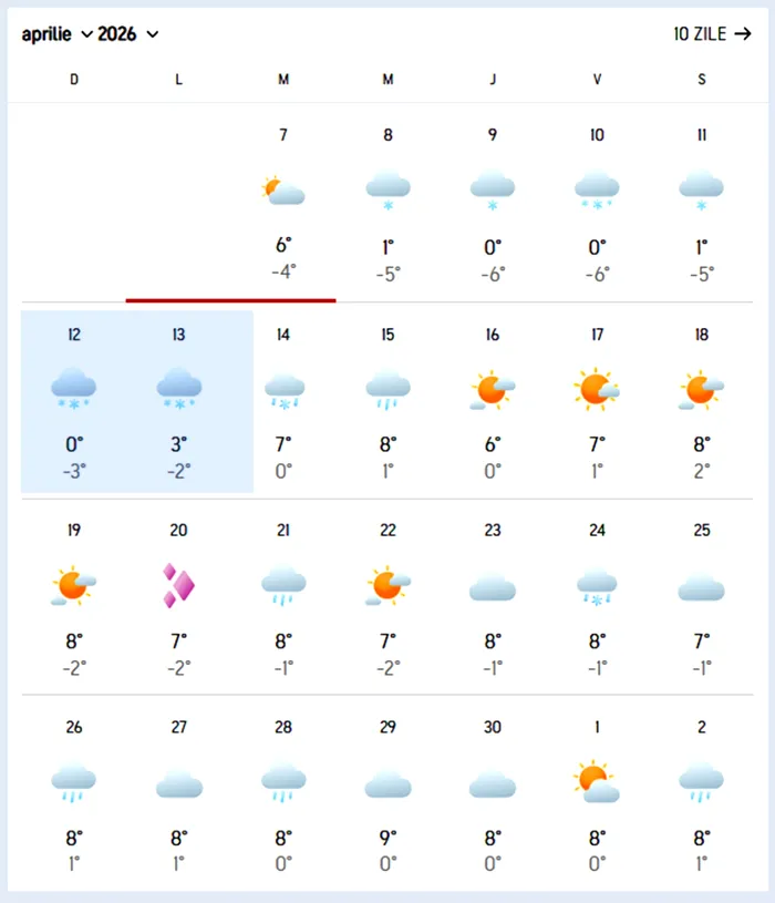 Mai jos poate fi privită prognoza pentru zona Predeal. Începând cu ziua de 8 aprilie 2026 până pe 15 aprilie 2026 se vor înregistra ninsori. Temperatura maxima va oscila între 3 și 0 (zero) grade Celsius. Temperatura minimă va coborî până la -6 grade Celsius. De asemenea, un episod de lapoviță și ninsoare va mai fi pe 24 aprilie 2026. Spre finalul lunii, vremea se va menține în general închisă.