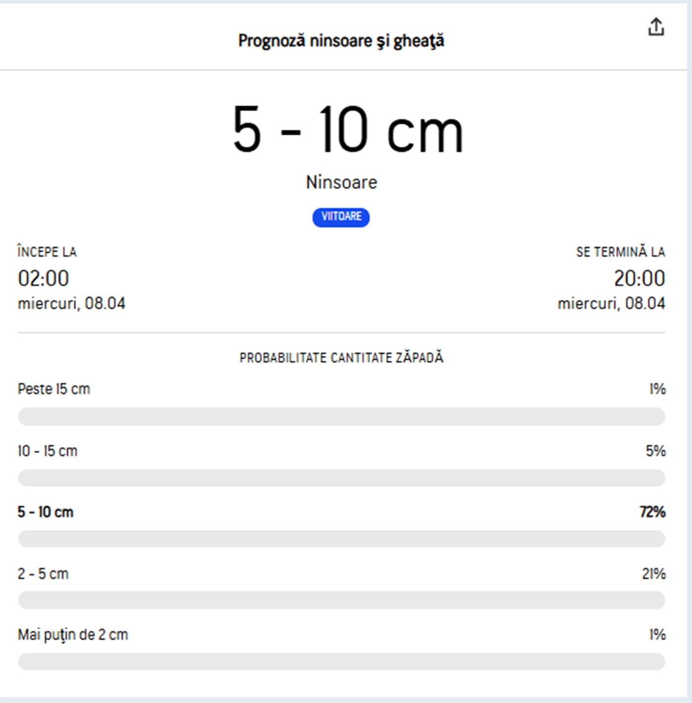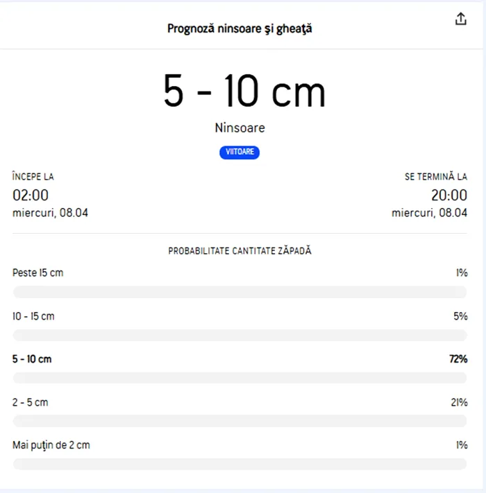 De altfel, viscolul își va face simțită prezența. Potrivit prognozei, care poate fi văzută mai jos, ninsoarea începe la ora 02:00 și se termină la ora 20:00, în ziua de miercuri, 8 aprilie 2026. Sunt șanse de 1% ca stratul de zăpadă să ajungă la 15 centimetri.