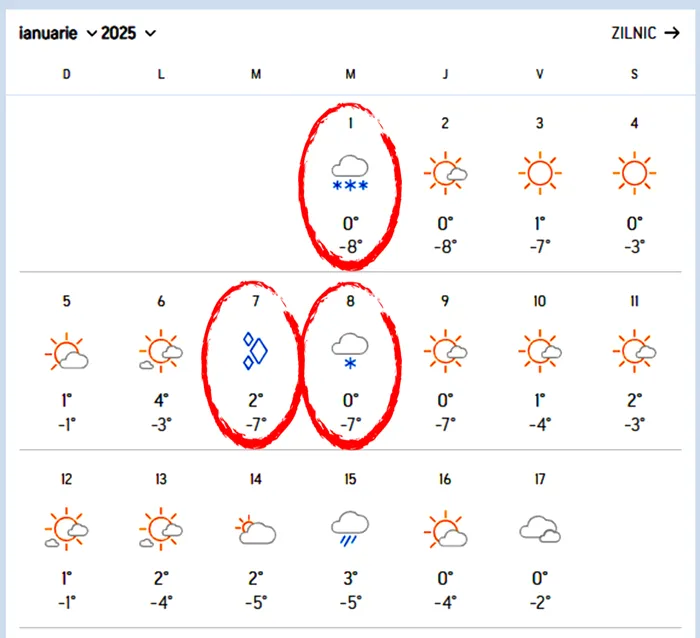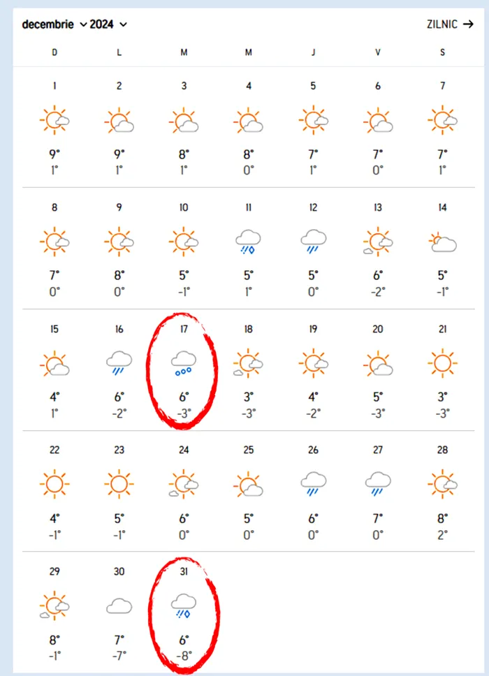 După o zi ploioasă pe 16, pe 17 decembrie va avea loc prima ninsoare a lunii. Și în următoarele două săptămâni, vremea va rămâne răcoroasă, cu temperaturi minime între -1 și -3°C.