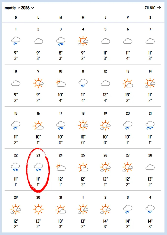 Chiar dacă vremea bună vrea să își intre în drepturi, există încă riscul unor episoade scurte de ploi sub formă de lapoviță sau ninsoare, în special în primele zece zile ale lunii.