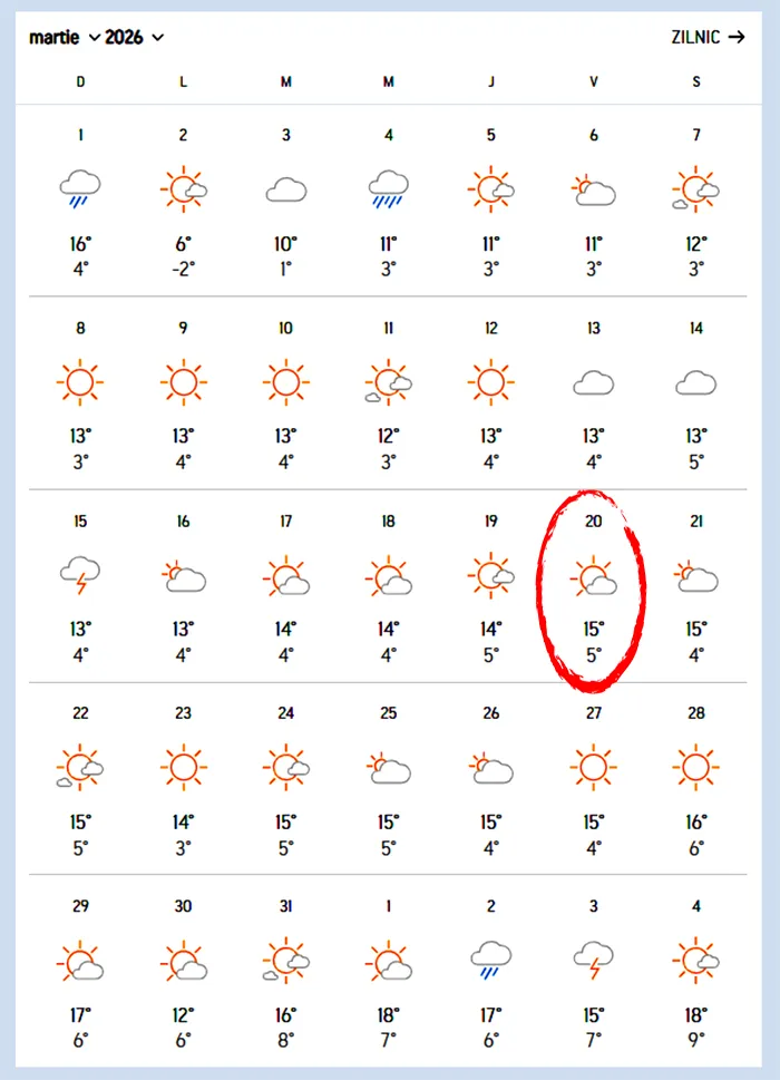 Potrivit meteorologilor Accuweather, primăvara va veni în Capitală pe data de 20 martie 2026. De atunci, temperaturile vor fi în creștere, cu 15 grade ziua și 5 grade pe timpul nopții.