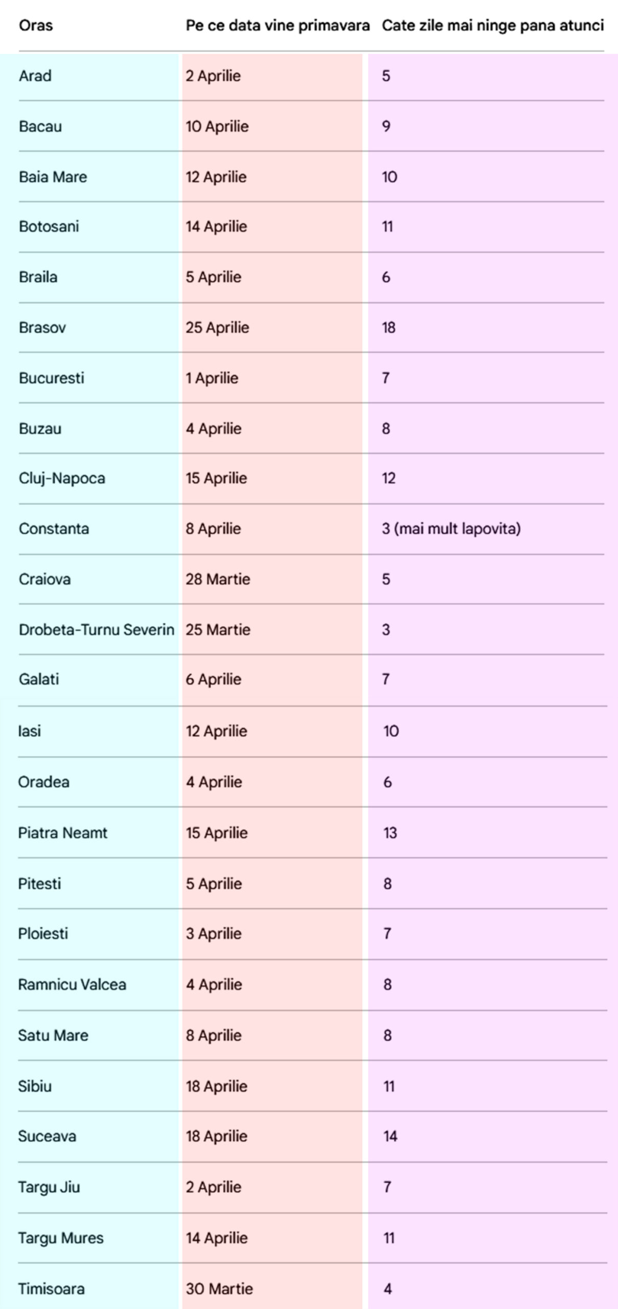 Gândul.ro a întocmit un tabel (vezi mai jos) cu 25 cele mai mari orașe din România, în ordine alfabetică. În dreptul fiecărui oraș au fost trecute două aspecte importante, și anume data la care vine primăvara și câte zile cu ninsori se vor mai înregistra în zona respectivă, până atunci. Data venirii primăverii depinde de condițiile meteorologice. Practic, atunci când nu se vor mai înregistra precipitații sub formă de ninsoare și când temperaturile vor fi mai mari de 15 grade Celsius.