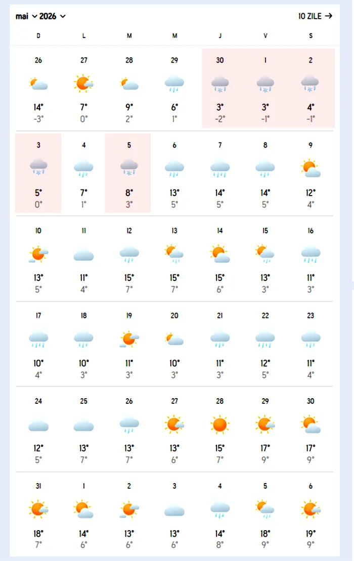 Astfel, o să ningă în luna mai, chiar și pe 1 Mai, zi liberă pentru români.