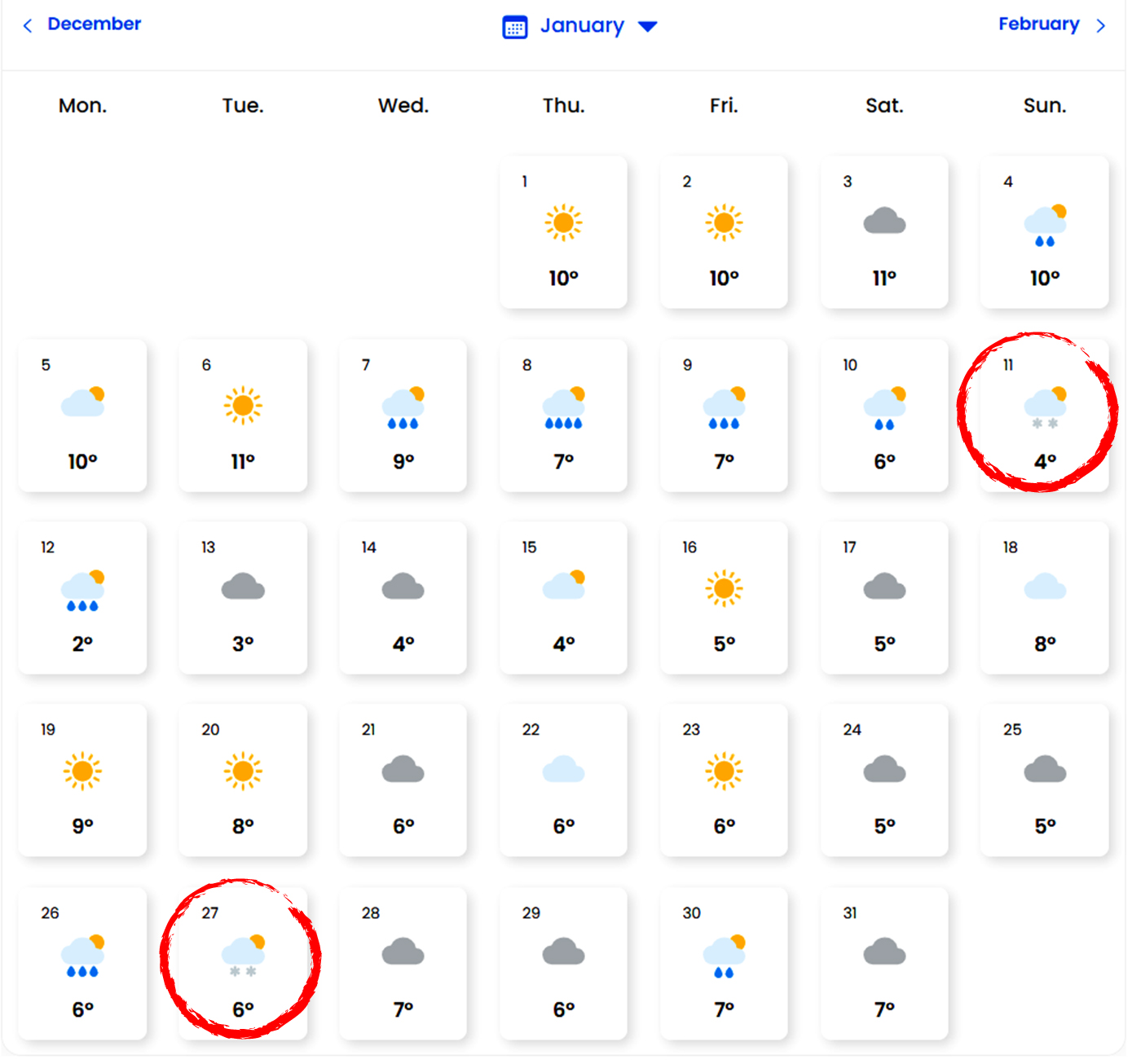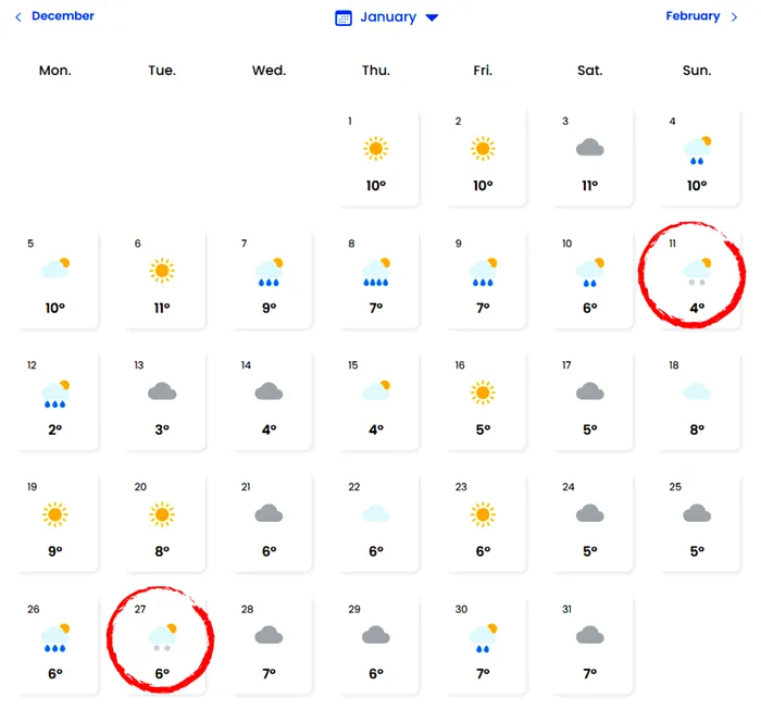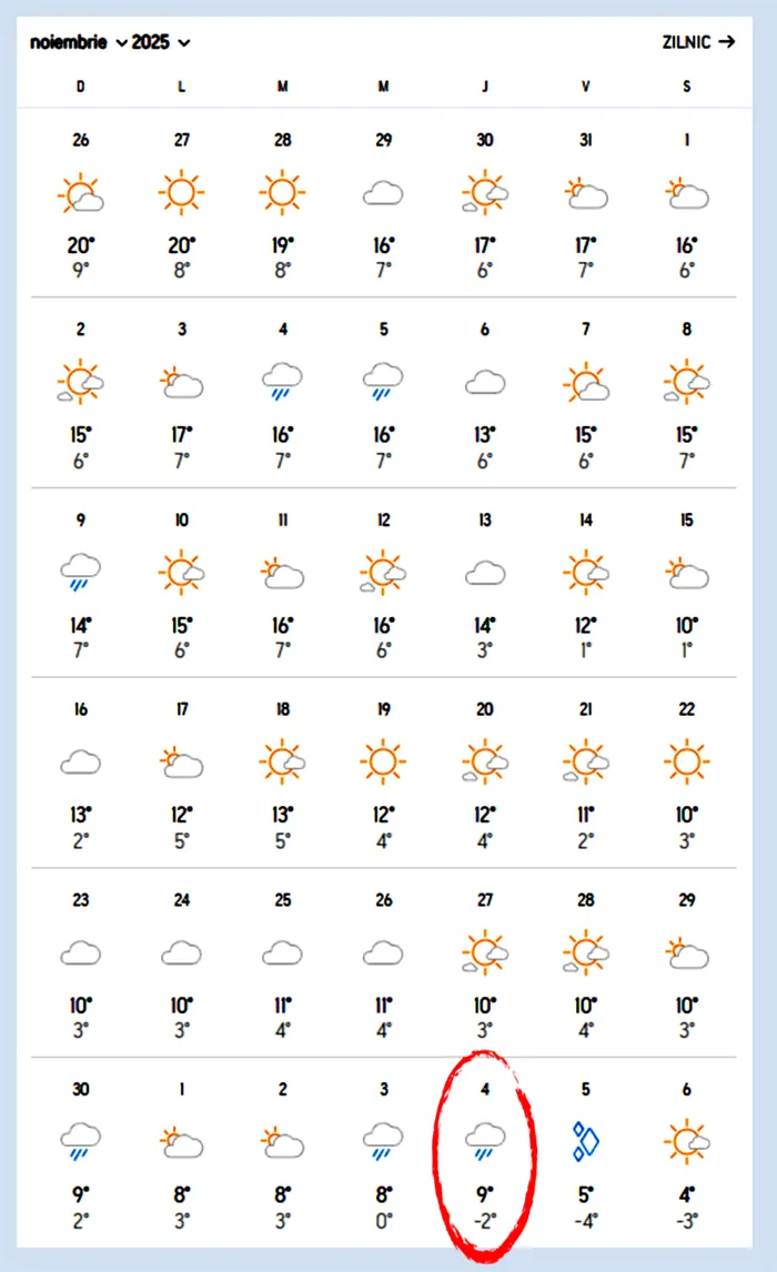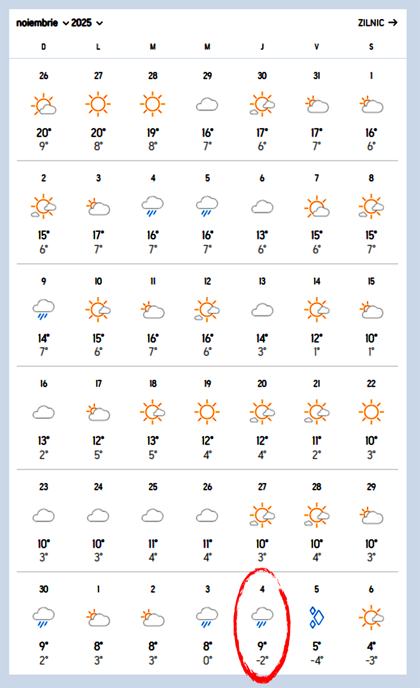 Astfel, în luna decembrie, prima lună de iarnă, în București nu sunt anunțate ninsori, potrivit meteorologilor EaseWeather. Va fi însă o lună cu zile mohorâte și ploioase. Sunt 8 zile în care plouă, în luna decembrie. În rest, vremea va fi închisă, iar temperaturile nu depășesc 10 grade C. Nu va ninge nici pe 20 decembrie, în ziua de Ignat.