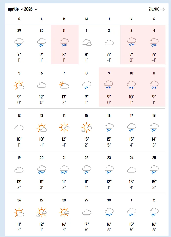 După un trio însorit, în 26-27-28 martie, timpul mohorât va reveni cu precipitații și temperaturi răcoroase, în 30 aprilie – 1-2 mai.
