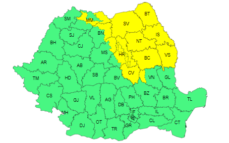 Administrația Națională de Meteotologie a emis un nou cod galben de ploi torențiale, furtuni și grindină în mai multe județe din nordul, estul și centrul țarii.