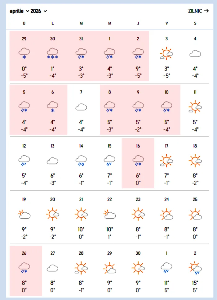 Conform datelor AccuWeather, în aprilie sunt mai multe intervale în care precipitațiile se transformă în lapoviță și ninsoare. Zilele de la finalul lunii martie și începutul lunii aprilie, dar și perioada 8-10 aprilie și 16 aprilie sunt marcate de astfel de episoade în zonele montane.