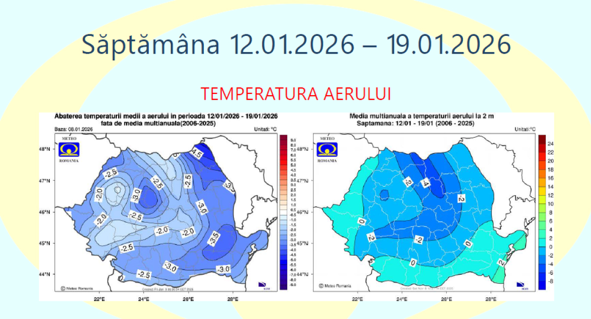 Potrivit prognozei ANM, în intervalul 12 – 19 ianuarie, valorile termice vor fi mai coborâte decât cele normale pentru această perioadă, pe întreg teritoriul României. Gerul va fi resimțit mai ales noaptea și dimineața, când temperaturile vor coborî semnificativ sub zero grade.