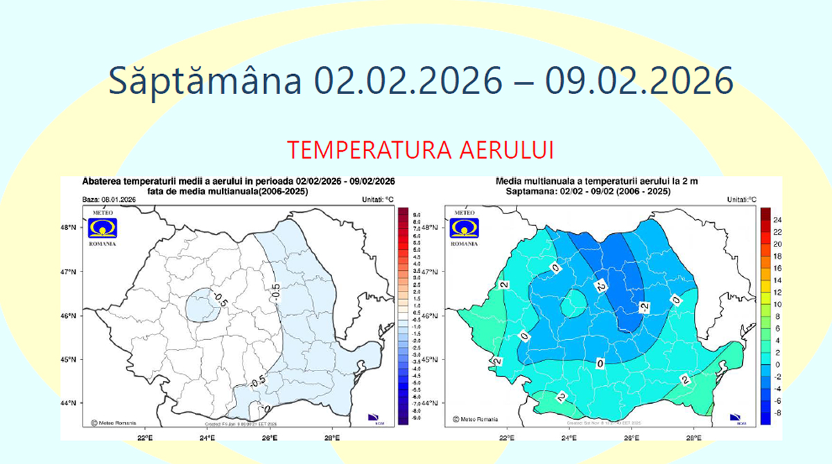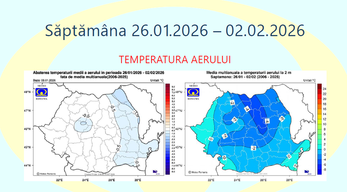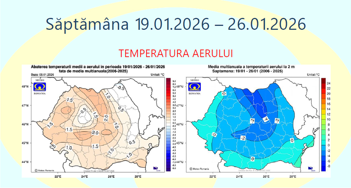 Pentru acest interval, temperatura medie a aerului va avea valori apropiate de cele normale pentru sfârșitul lunii ianuarie, în cea mai mare parte a României.