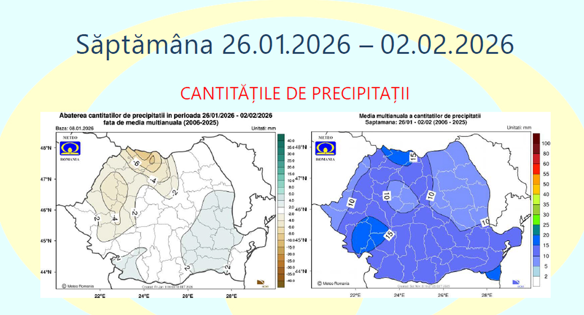 Cantitățile de precipitații vor fi local deficitare în zonele montane, în timp ce în restul teritoriului se vor menține în jurul mediilor climatologice.