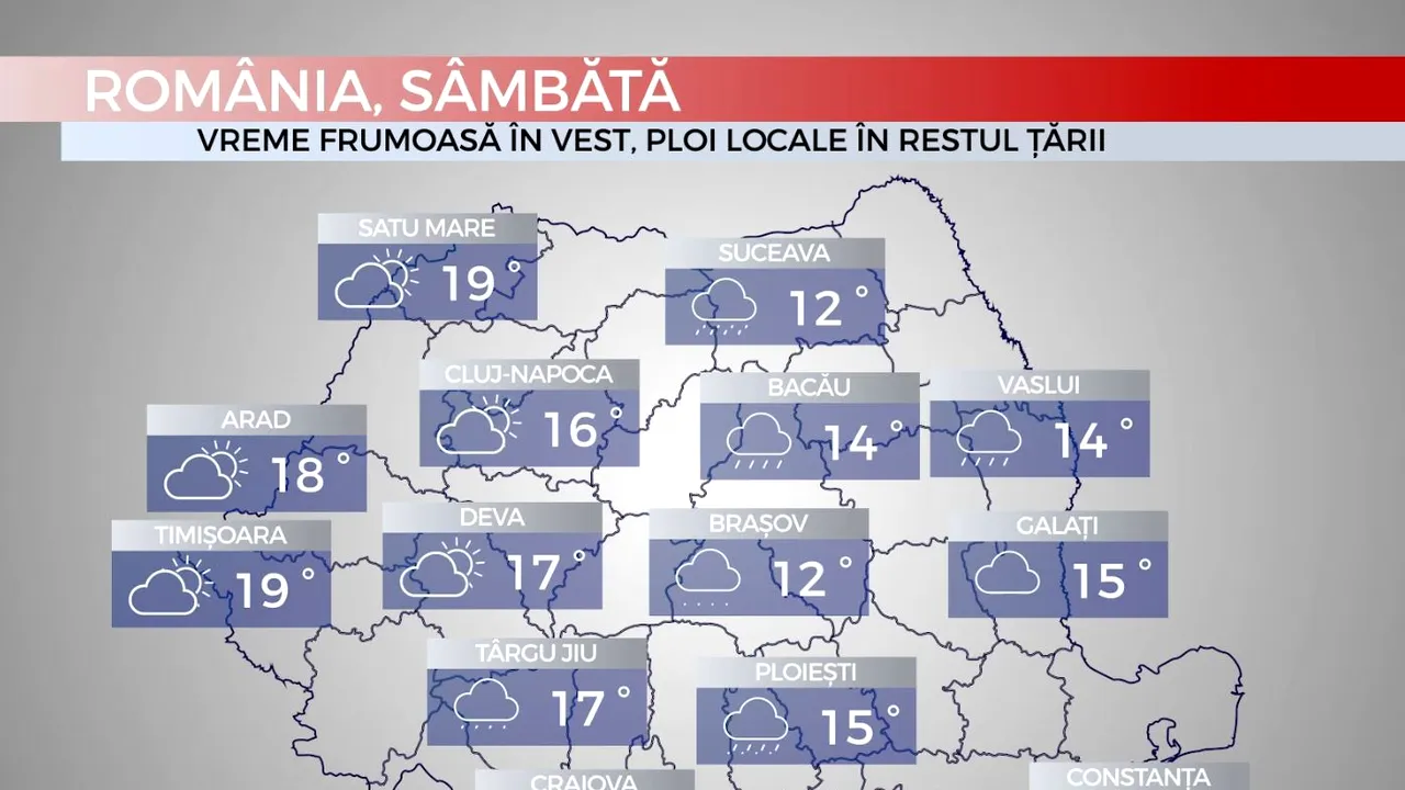 „În ceea ce privește evoluția vremii în țară, în acest weekend nu scăpăm de ploi, nici de înnorări. Sâmbătă, vor fi înnorări mai accentuate în prima parte a intervalului în Sudul, Estul și Centrul țării, iar noaptea cu precădere în jumătatea nordică a teritoriului, însă doar pe arii restrânse, trecător va ploua slab”, a mai spus Oana Catrina.