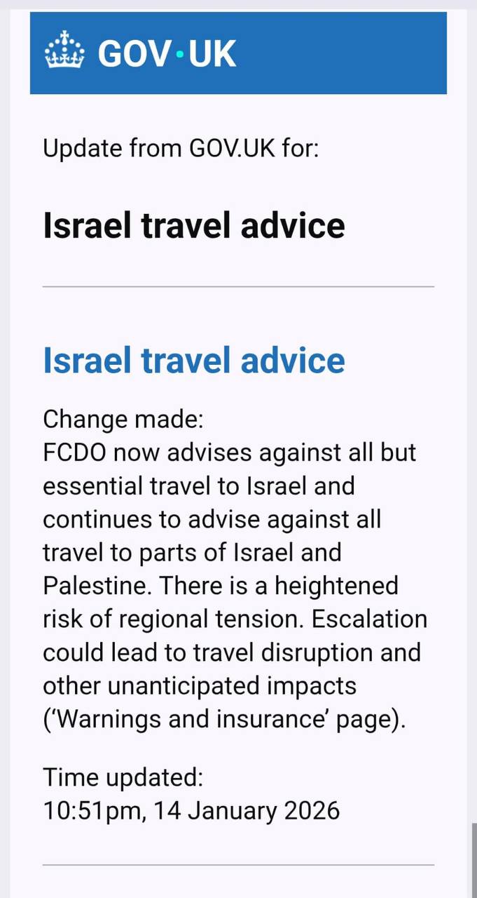 Ministerul de Externe al Marii Britanii (FCDO) recomandă acum evitarea oricărei călătorii neesențiale în Israel și continuă să recomande evitarea călătoriilor în anumite părți ale Israelului și Palestinei. Există un risc crescut de tensiuni regionale. O escaladare ar putea duce la perturbări ale călătoriilor și alte efecte neprevăzute.