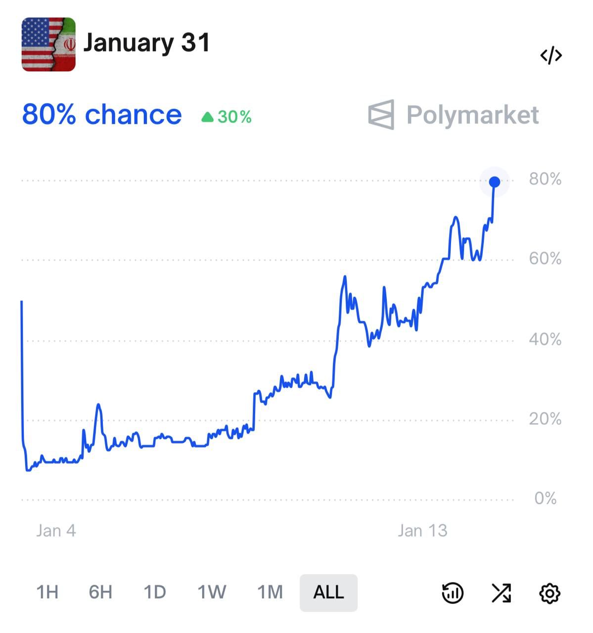 NOU: Polymarket afișează acum o probabilitate de 80% ca SUA să atace Iranul înainte de 31 ianuarie 2026.