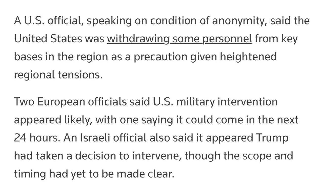 Statele Unite au început evacuarea personalului din cea mai mare bază militară americană din Orientul Mijlociu, baza aeriană Al-Udeid din Qatar. Potrivit agenției Reuters, trupelor și personalului civil li s-a ordonat să părăsească baza până în această seară. Această informație a fost confirmată de diplomați, care au discutat cu jurnaliștii sub protecția anonimatului.